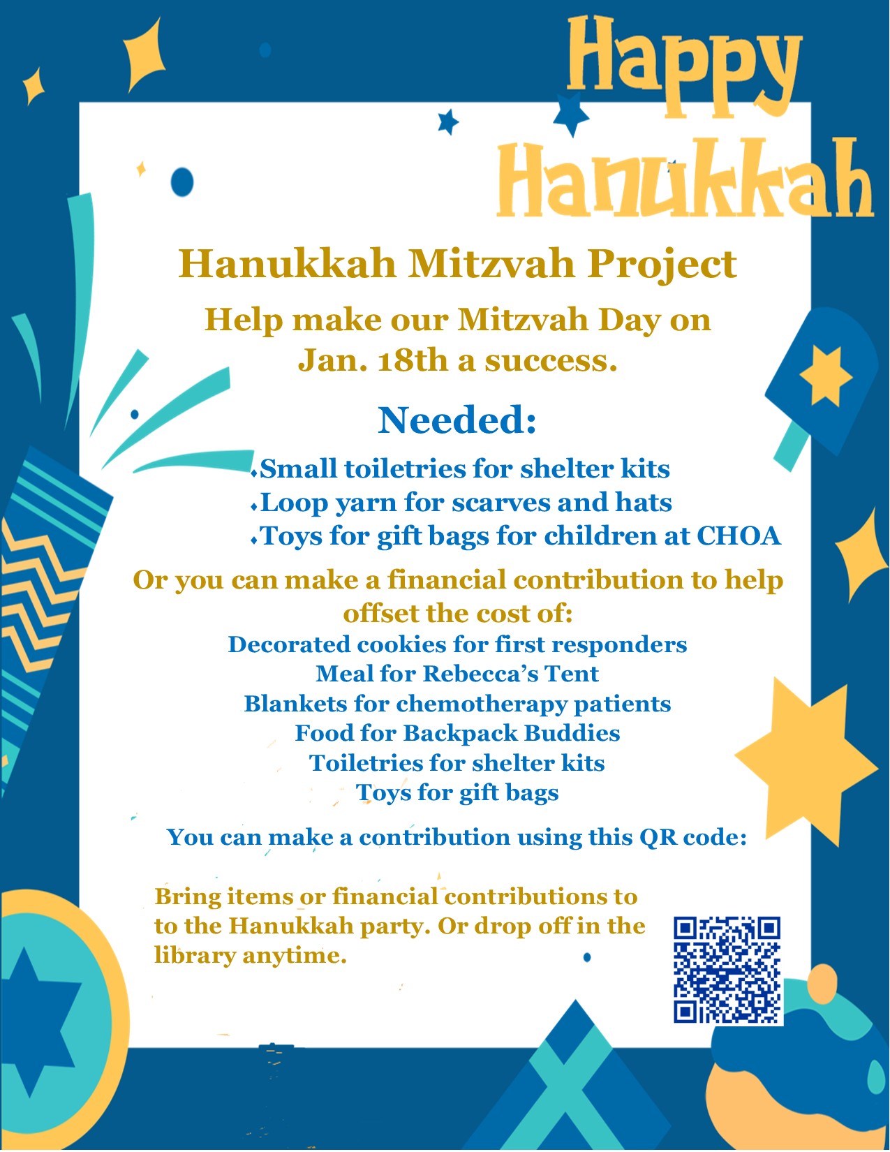 Help Make our Mitzvah Day on January 18, 2026, a success by donating items or making a financial donation.. click here for details.