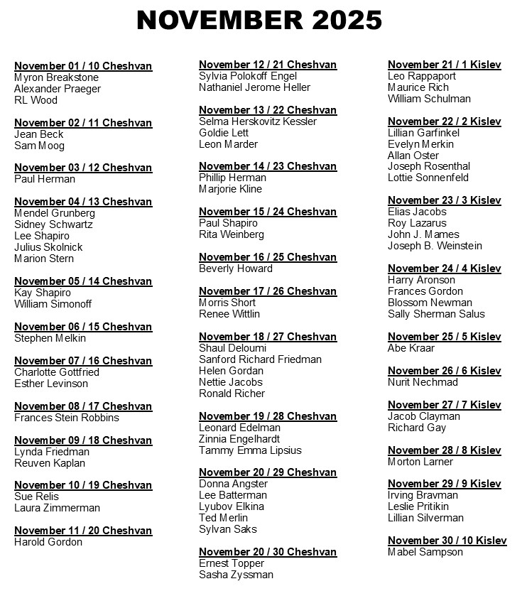 Each month we will provide the list of our love ones to include Names, English & Hebrew dates of their Yahrzeit.